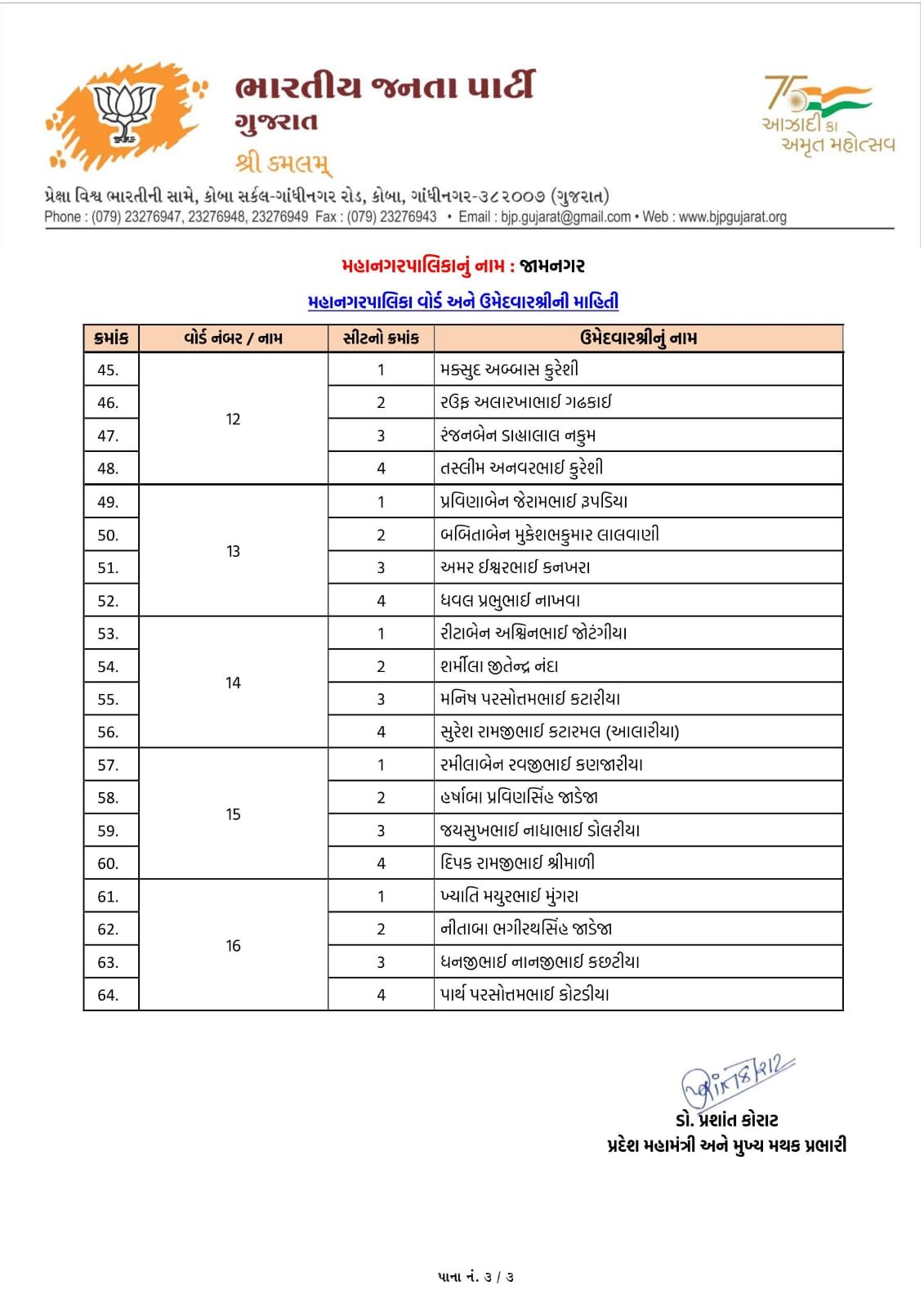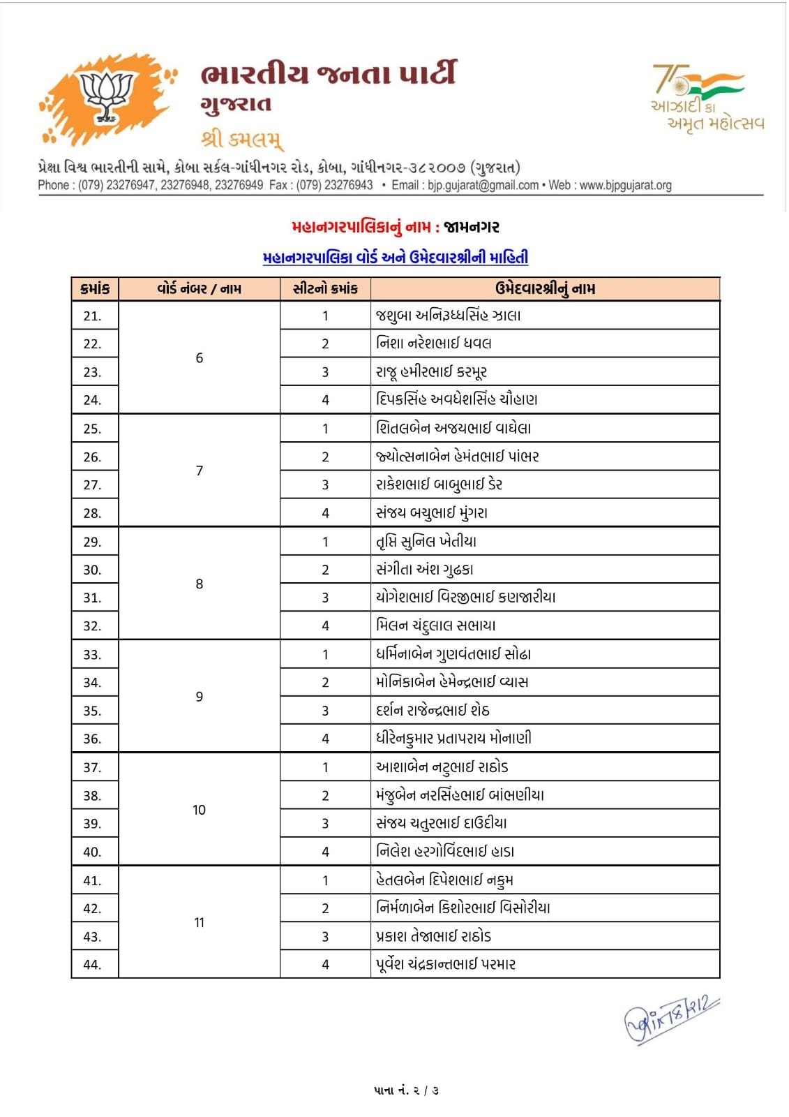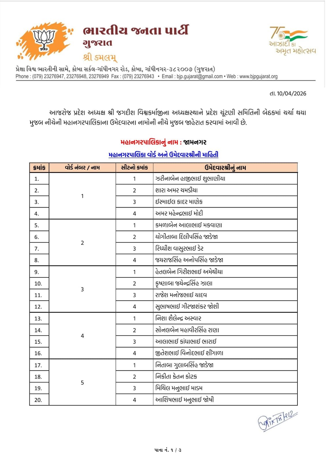 Jamnagar જામનગરમાં ભાજપે કોર્પોરેશન માટે ઉમેદવારોના નામની યાદી જાહેર કરી By Desh Devi News - April 10, 2026 0 254405 WhatsAppFacebookTelegramTwitterPrintPinterestLinkedinReddIt જામનગરમાં ભાજપે કોર્પોરેશન માટે ઉમેદવારોના નામની યાદી જાહેર કરી