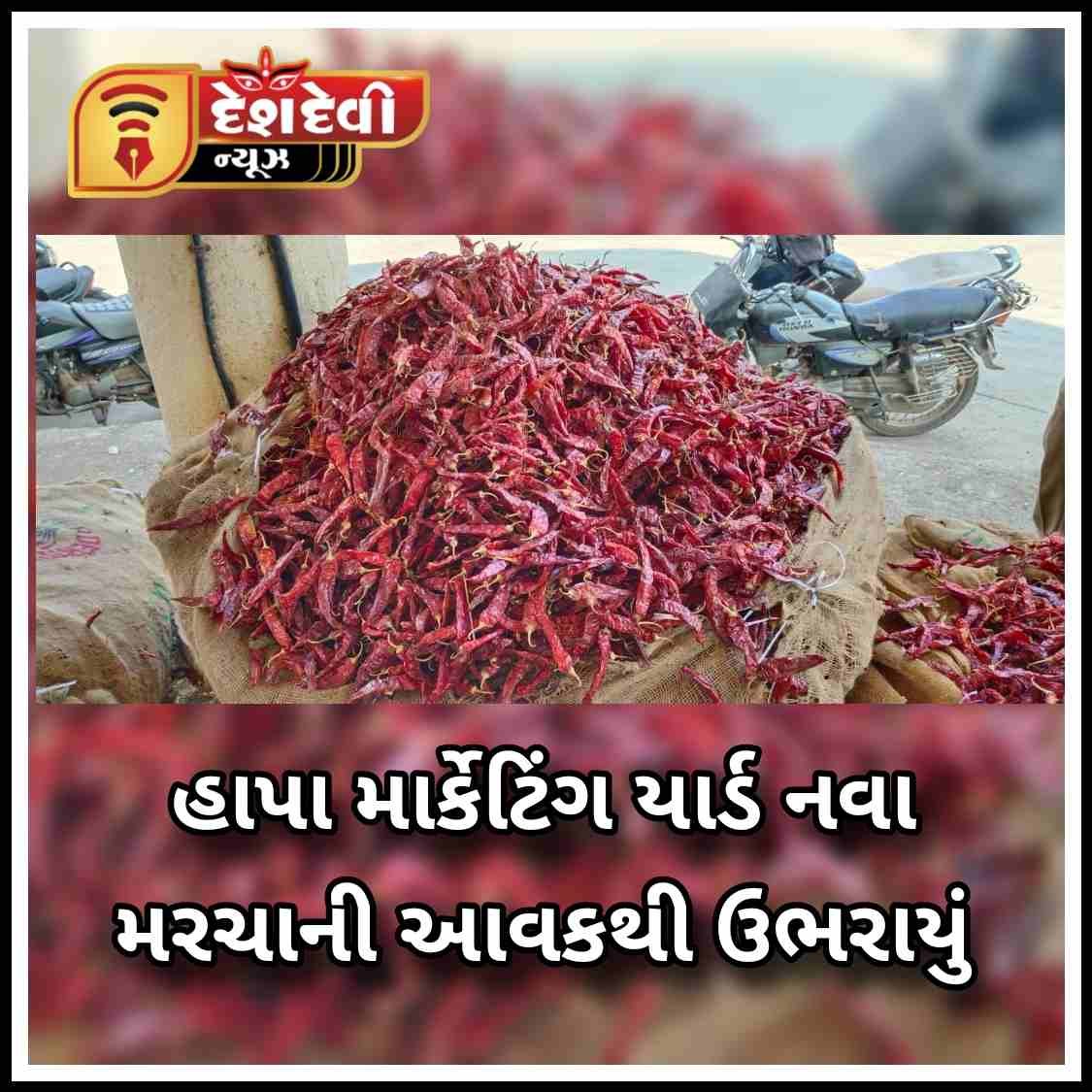 જામનગરના હાપા માર્કેટિંગ યાર્ડમાં આજે વહેલી સવારથી નવા મરચા ની આવક શરૂ થઈ હતી, અને ખેડૂતો દ્વારા જુદા જુદા ૨૦૫ જેટલા વાહનોમાં મરચાંની ભારી નો જંગી જથ્થો ઠાલવવામાં આવ્યો હતો અને બપોર સુધીમાં ૧૦,૦૦૦ થી વધુ મરચાની ભારીની આવક થઈ હતી, જેથી બપોરે ૧૨.૦૦ વાગ્યાથી નવી જાહેરાત ન થાય ત્યાં સુધી હાપા માર્કેટિંગ યાર્ડમાં મરચાની આવક ને બંધ રાખવાની ફરજ પડી છે.