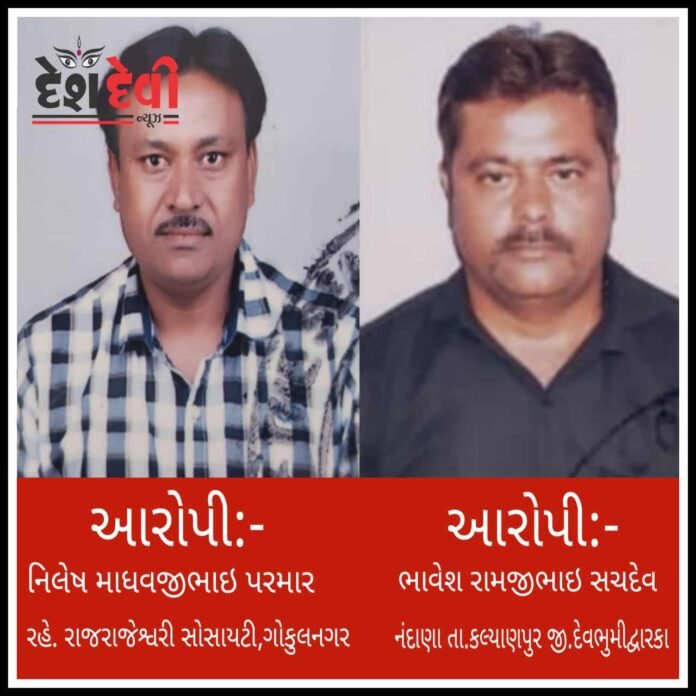 • આરોપી: (૧) નિલેષભાઇ માધવજીભાઇ પરમાર રહે. રાજરાજેશ્વરી સોસાયટી,ગોકુલનગર જામનગર ૯૯૦૯૫૧૧૦૫૬ (૨) ભાવેશ રામજીભાઇ સચદેવ રહે. નંદાણા તાઃકલ્યાણપુર જી.દેવભુમીદ્વારકા