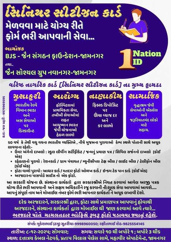 દેશ દેવી ન્યુઝ જામનગર  તા ૩, ડિસેમ્બર ૨૫ જામનગર શહેરમાં વસવાટ કરતા અને ૬૦ વર્ષ પુરા થઇ ગયા હોય તેવા વરિષ્ટ નાગરીકો ને સરકાર દ્વારા “સિનિયર સીટીઝન કાર્ડ” આપવામાં આવનાર છે. જે વરિષ્ઠ નાગરિકોએ આ કાર્ડ કઢાવેલું હશે, તેઓને સરકારની અનેક યોજના નો લાભ મળી શકશે.વરિષ્ટ નાગરીકો ને “સિનિયર સીટીઝન કાર્ડ” મેળવવા સહાયરૂપ થવા માટે જામનગર ના બી.જે.એસ. જૈન સંગઠન 7 ફાઉન્ડેશન-જામનગર અને જૈન સોશ્યલ ગ્રુપ નવાનગર, જામનગર દ્વારા કેમ્પ નું આયોજન કરવામાં આવ્યું છે.જેમાં તા. ૮-૧૨-૨૦૨૫ સોમવારે સવારે ૧૦ થી ૧ અને બપોરે 3 થી ૬ દરમ્યાન ૬૦ વર્ષ કે તેથી વધુ ઉમરના વરિષ્ટ નાગરીકો એ જરૂરી ડોકયુમેન્ટ સાથે આવવાનું રહેશે. સંસ્થા ના કાર્યકરતાઓ યોગ્ય રીતે ફોર્મ ભરી, ડોકયુમેન્ટ ચકાસી અને ફોર્મ સક્ષમ અધિકારી ને કાર્ડ ની કાર્યવાહી કરવા માટે સોપી દેશે.જેમનો વારો આવશે તેમને ફોન થી જાણ કરીને સેવા-સદન માં રૂબરૂ ફોટા પડાવવા જવા માટેની જાણકારી આપવામાં આવશે.આ કેમ્પ પૂરો થયા બાદ જામનગર શહેર માં અન્ય સ્થળે પણ આ પ્રકાર ના કેમ્પનું આયોજન કરી વરિષ્ટ નાગરીકો ને સહાય કરવામાં આવશે.